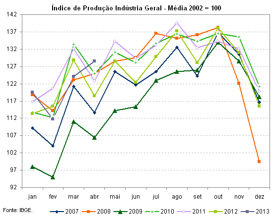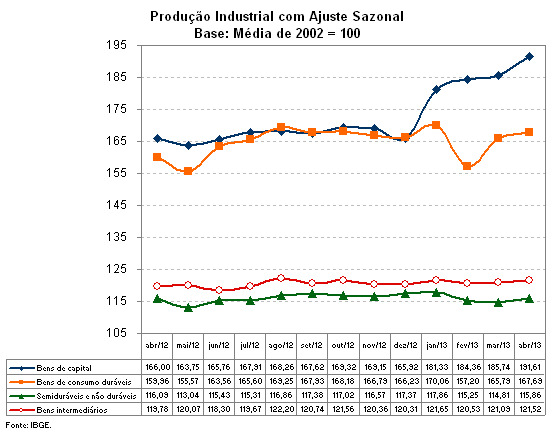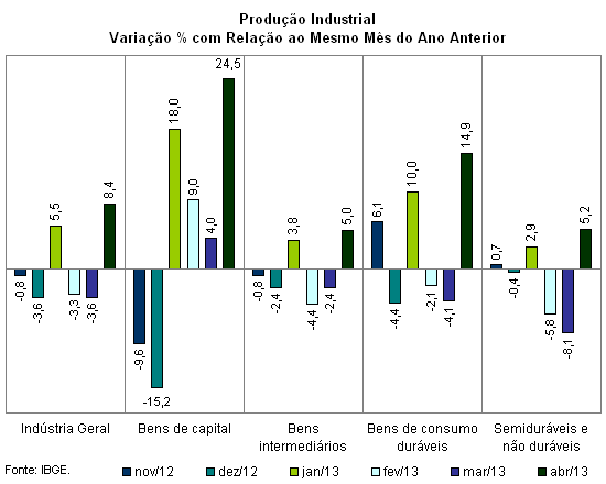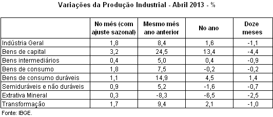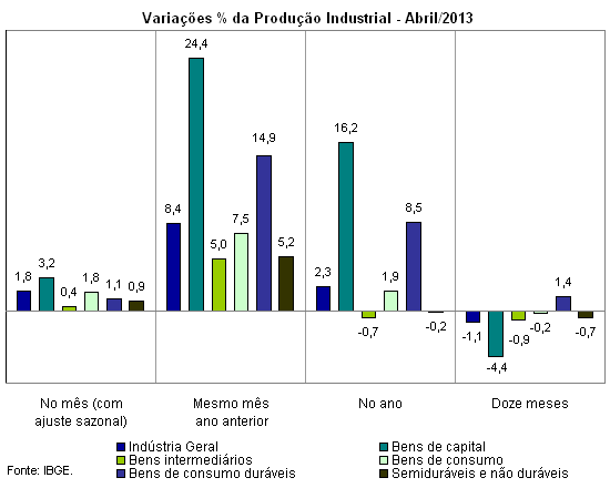 Segundo dados do IBGE, a indústria brasileira avançou 1,8% em abril comparativamente ao mês anterior, na série com dados dessazonalizados, após alta de 0,8% em março. Na comparação com abril de 2012, houve avanço da produção industrial em 8,4%. No acumulado dos quatro meses iniciais de 2013, a indústria brasileira assinalou expansão de 1,6% e, no acumulado dos últimos 12 meses encerrados em abril frente a igual período imediatamente anterior, a produção industrial mostrou redução no ritmo de queda frente às marcas registradas em fevereiro (–1,9%) e março (–2,0%).