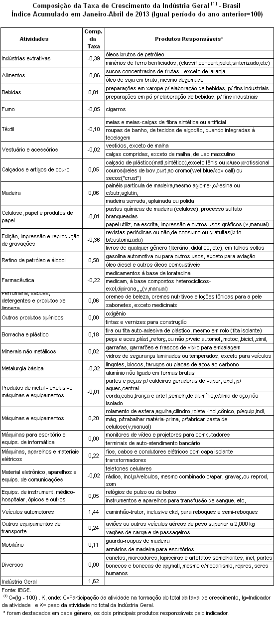 No acumulado de 2013 até abril, a produção de bens de capital (13,4%) e de bens de consumo duráveis (4,5%) foram as categorias com maior variação. A produção de bens intermediários (0,4%) apontou avanço menos acentuado que o da média da indústria (1,6%), enquanto o segmento de bens de consumo semi e não duráveis, com redução de 1,6%, assinalou o único resultado negativo no índice acumulado no ano.